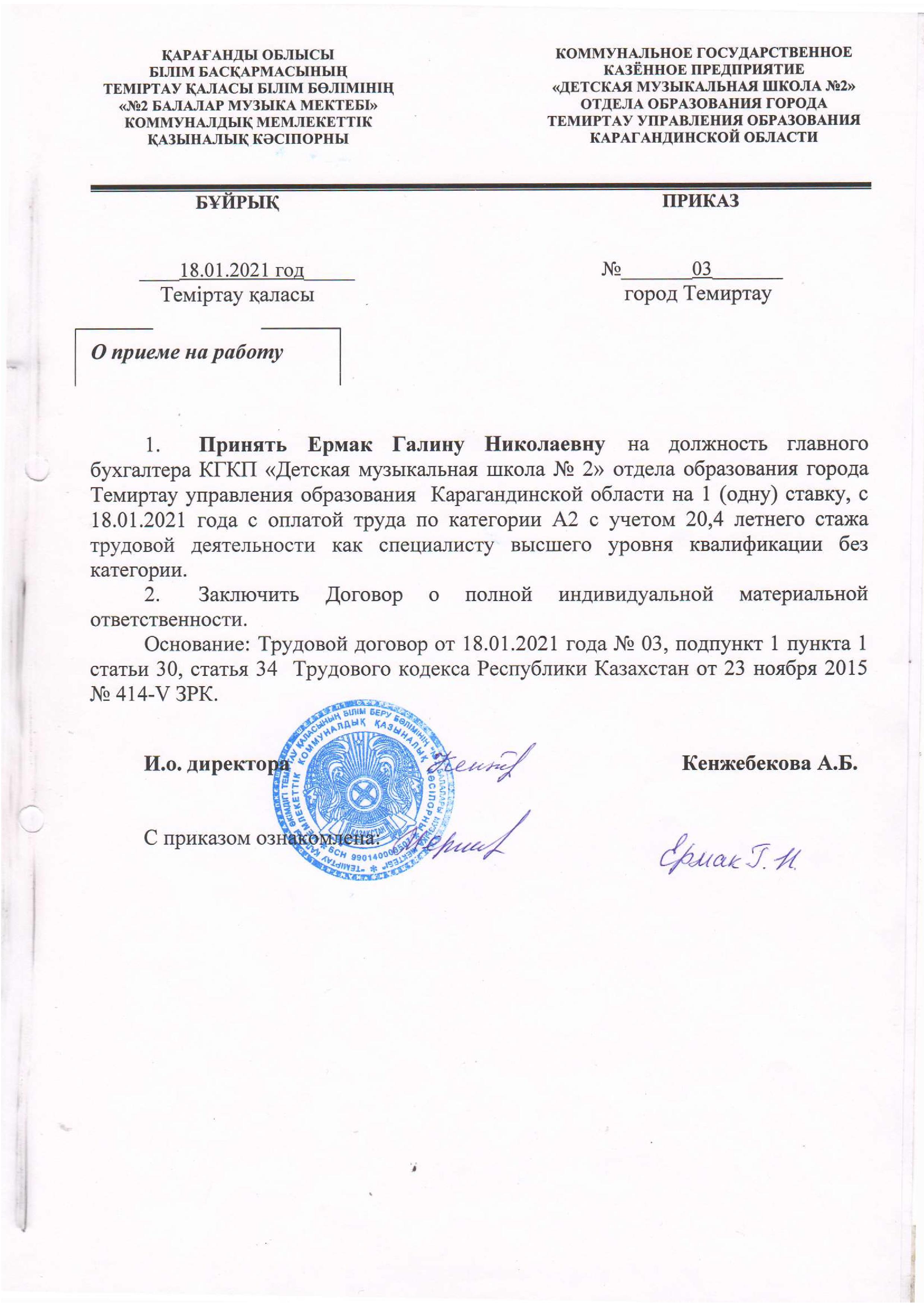 Бас есепшіні жұмысқа қабылдау туралы бұйрық